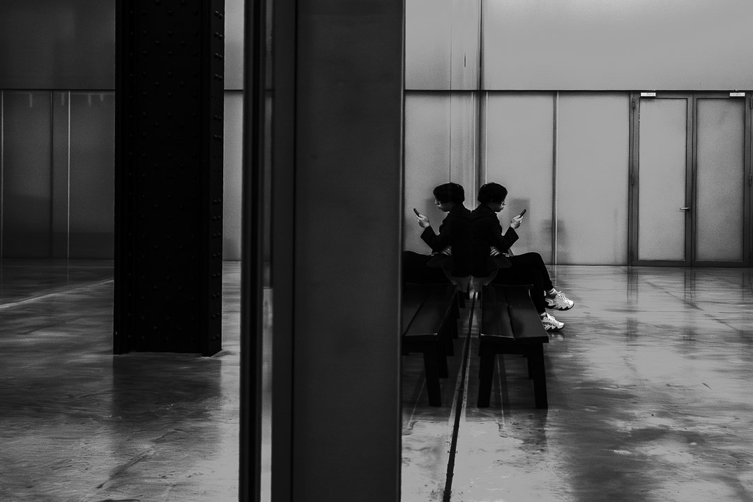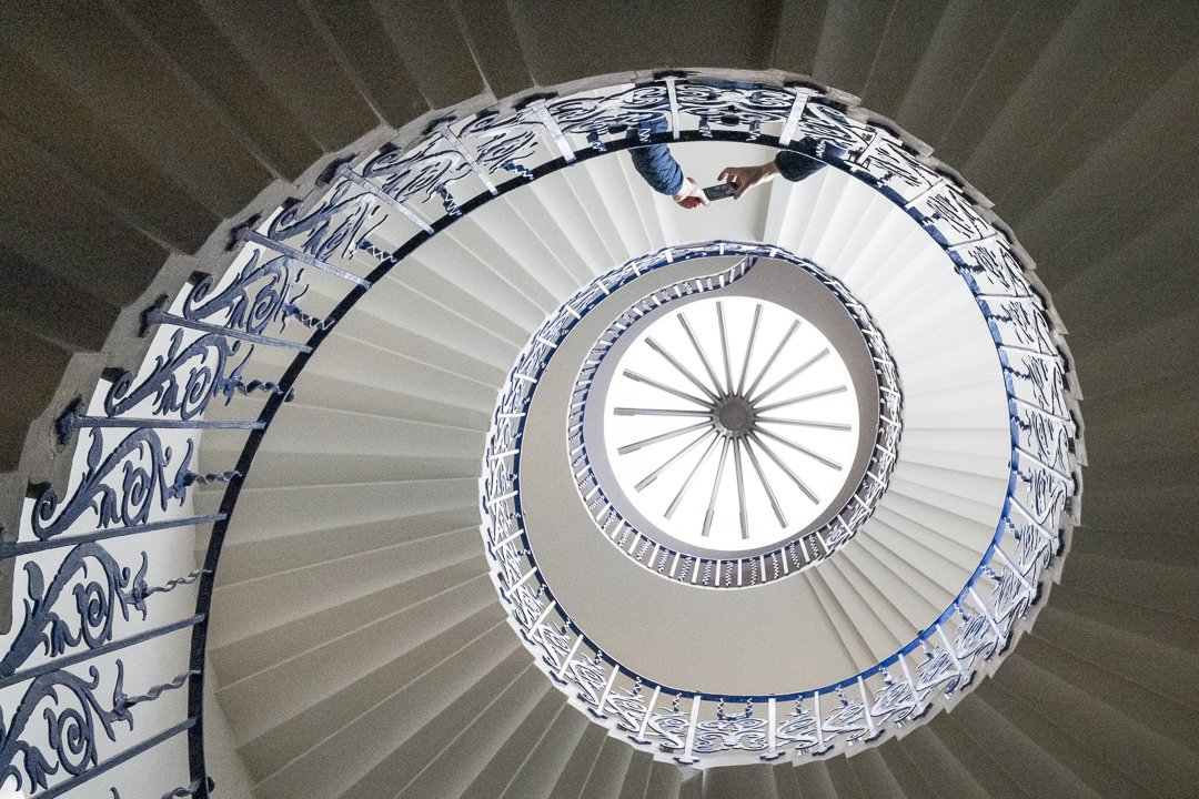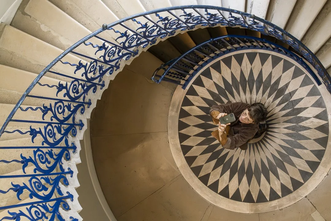 The Tulip Stairs, the Queen's House, Greenwich, looking down - a photographer looking up.