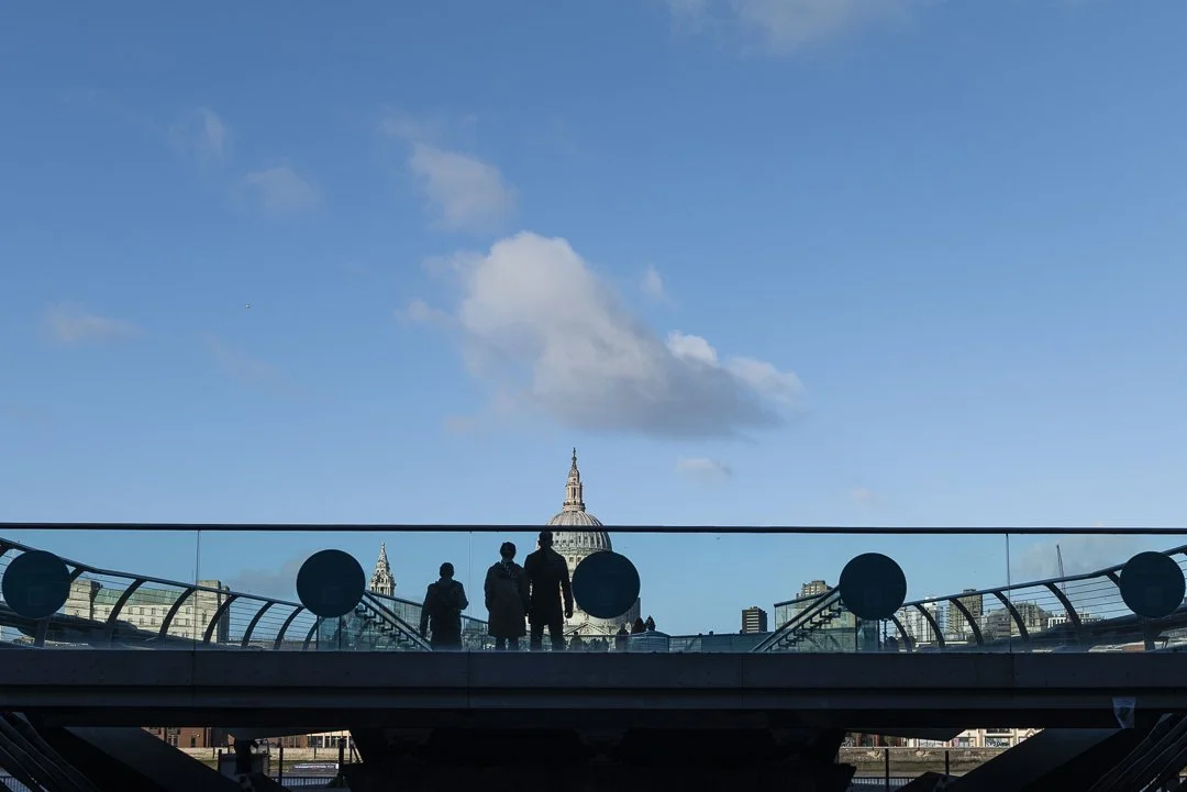 Silhouetted figures on the footbridge leading to St Paul's Cathedral.